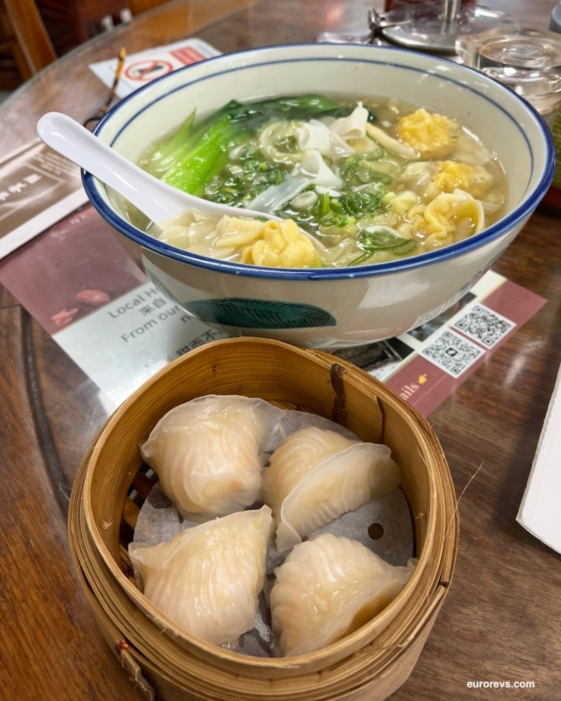 I dive right in to try the ho fun (rice) noodles, which are already ever so slightly over cooked for my liking. This bowl’s contents and I will be getting to know each other for a while, so I know they’ll be soggy before we really get down to business. The broth that introduces us is gentle – the MSG is there to replace the chicken which, left the won ton filling do all the talking. I’m OK with that. I added some white pepper off the cart to the side, which contained an astringent vinegar for the dim sum (not dissimilar to the one at Din Tai Fung).